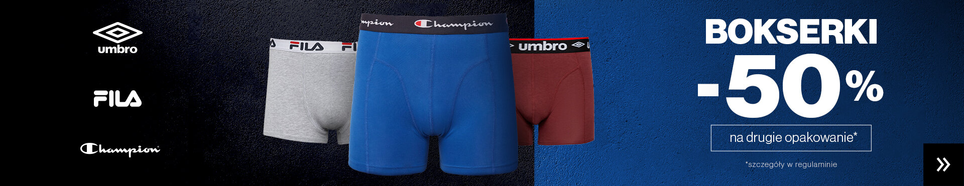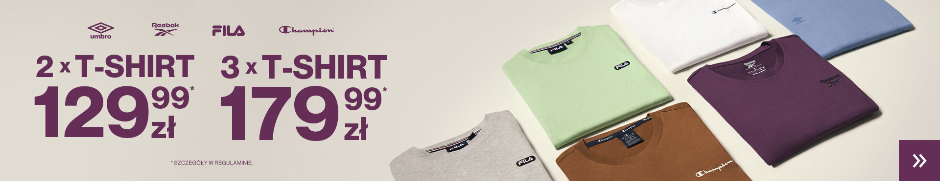 *Promocja dotyczy wybranych modeli t-shirtów Fila, Reebok, Umbro oraz Champion i nie łączy się z innymi akcjami. Jeśli chcesz skorzystać z dwóch promocji, złóż osobne zamówienia. Rabat wynikający z akcji naliczy się automatycznie w koszyku po dodaniu do niego produktów objętych promocją.