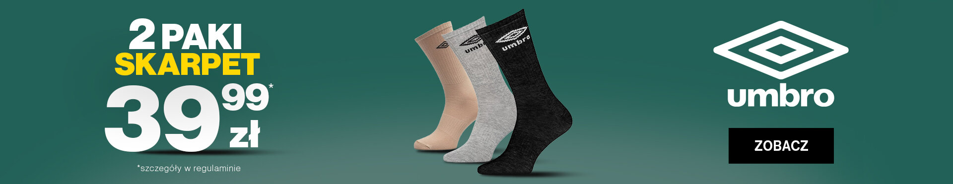 *Akcją objęte są skarpety Umbro. Kupując stacjonarnie, przed zakupem poinformuj sprzedawcę o chęci skorzystania z promocji. Online cena zostanie naliczona automatycznie w koszyku po dodaniu do niego dwóch opakowań skarpet objętych akcją. Jeśli chcesz skorzystać z dwóch promocji, złóż osobne zamówienia. Akcja nie łączy się z innymi promocjami.Szczegóły w regulaminie.