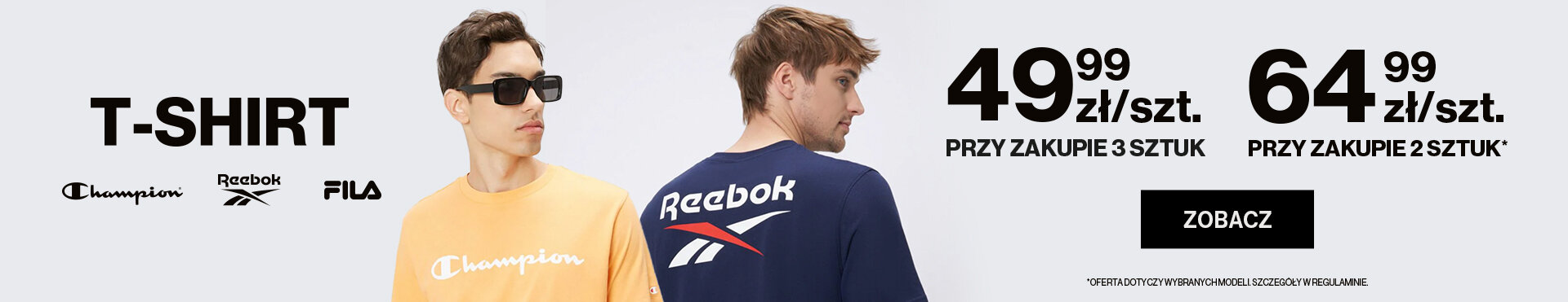 *Promocja dotyczy wybranych modeli T-shirtów marek Champion, Reebok, Fila i nie łączy się z innymi akcjami promocyjnymi. Jeśli chcesz skorzystać z dwóch promocji, złóż osobne zamówienia. Rabat wynikający z akcji naliczy się automatycznie w koszyku po dodaniu do niego produktów objętych promocją. Szczegóły w regulaminie.